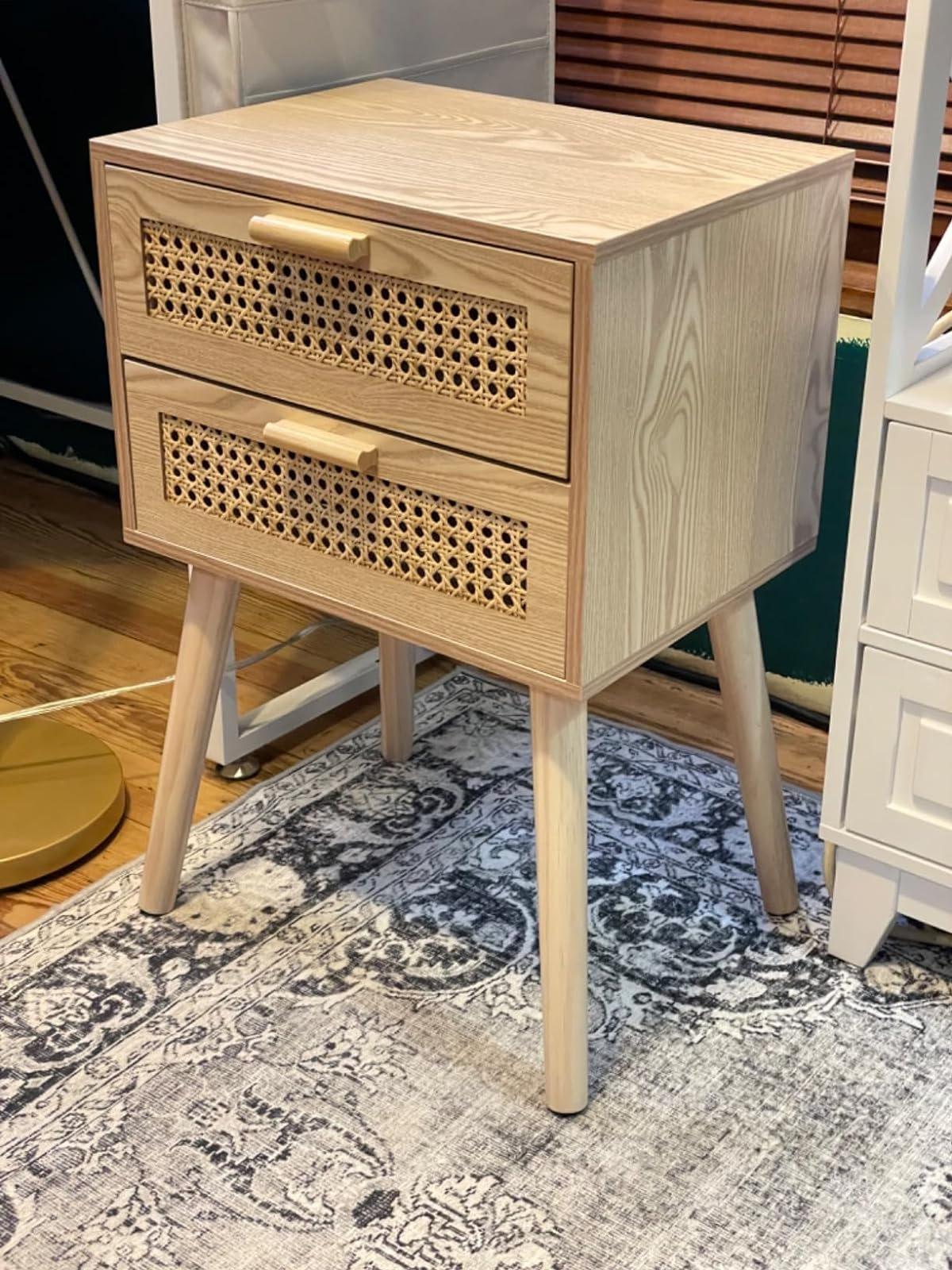 This bedside table is easy to assemble. One of the drawer boards had a small dent, but it doesn’t affect functionality. Love this table! It matches my decor perfectly and is a great size.There is a slight odor from the natural rattan and preservation materials, but hopefully, it fades over time.