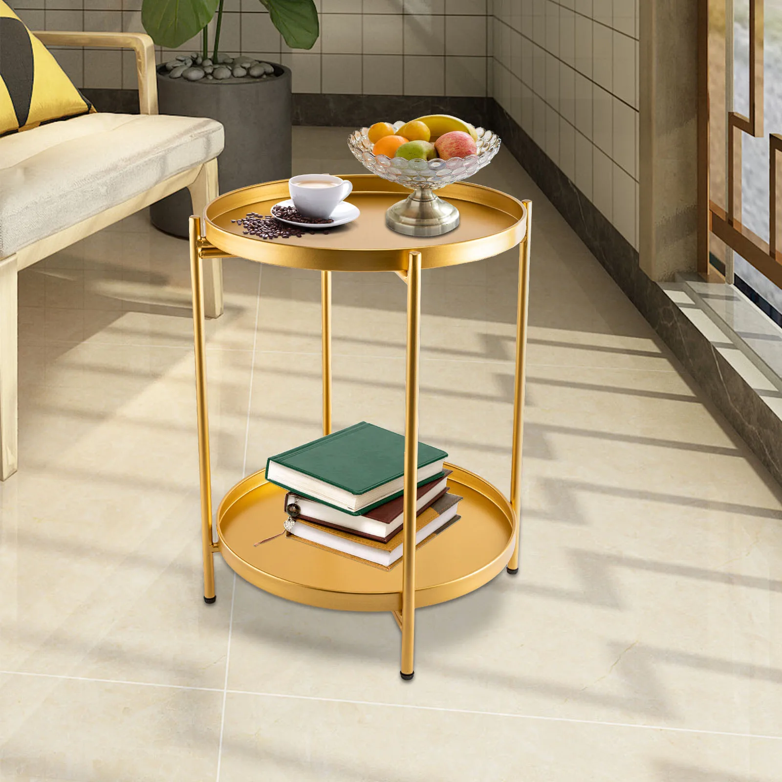 2-Tier End Table Folding Metal Round Side Table with Removable Tray for Living Room (Black/Gold/Golden Pink)